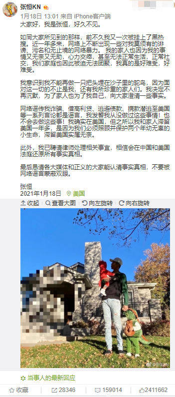 在本月18號的中午,張恒出面回應(yīng)前段時間列為被執(zhí)行人一事,表示自己滯留美國是因為必須要保護兩個年幼無辜的小生命。自己也曬出了和這兩個孩子的照片,同時也說出了這兩個孩子的年齡一歲零一個月。